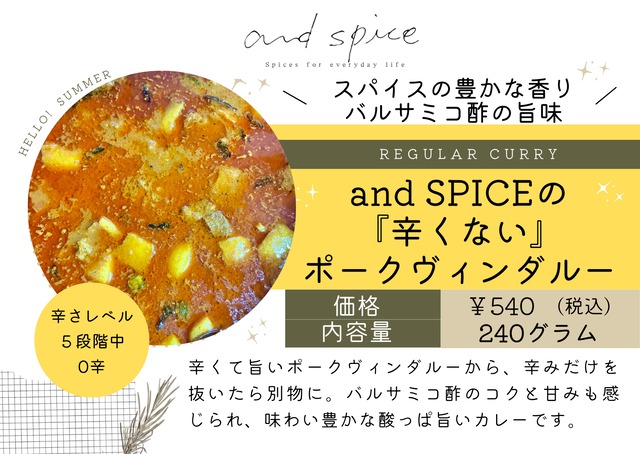 ヴィンダルー(Vindaloo)はインド各地で親しまれているゴア発祥のカレー料理。 ヴィンダルーの名前は、ポルトガルのワインとニンニクを使用した豚肉料理「カルネ・デ・ヴィーニャ・ダリョス」(carne de vinha d'alhos)に由来し、ポルトガル人からインド西海岸中部・ゴア地方に伝承された、今やゴアを代表する料理として進化したカレーです。 豚肉を使用し、ワインビネガーなどの酢の酸味とスパイスの辛みを効かせた“すっぱ辛さ”が特徴です。 通常はワインビネガー(特に白)を使うことが多いのですが、and SPICEは今回バルサミコ酢を使用しています。バルサミコ酢を煮詰めると甘みが出てきますが、それ由来のかすかな甘みを感じられます。それが豚肉とも非常にマッチします。 こちらのカレーは本来、かなり辛さがあるのですが、なぜ辛くないバージョンを作ることになったのか。今回このカレーを作るきっかけになったのは、知人の一言。 『ヴィンダルーの味は好きなんだけど、辛いのが得意じゃないから、辛くないバージョンがあったらいいのにな~』 その一言を受け、よーし、作ってみるか~!となったわけです。 そしたら美味しくて作った本人がびっくり(笑) 辛さが無いとこんなにもバルサミコ酢やココナツミルクのコクや旨味が感じられる。 旨さがしっかり感じられるのにスパイス感は相変わらずガンガン来ます。 これは辛さが苦手な方に思いっ気入り楽しんでもらえるカレーになったのでは、と感じています。 使用しているスパイスは コリアンダー、パプリカ、カイエンペッパー、ブラックペッパー、ターメリック、カルダモン、クローブ、カレーリーフです。 スパイスの女王カルダモンが口の中でスーっ香ると思いきや、クローブのほろ苦さや漢方のような風味、カレーリーフの柑橘の香りも時々香ってきます。 一口ごとに色々なスパイスを感じてもらえたら嬉しいです。 豚肉は肩ロースを使用しています。肩ロースは脂身と赤身のバランスが良く、カレーに最も合うお肉の部位だと思います。 豚肉は疲労回復にも良いとされますからね。 辛くないポークヴィンダルーを美味しく食べて、疲れもぶっ飛ばしましょう!
