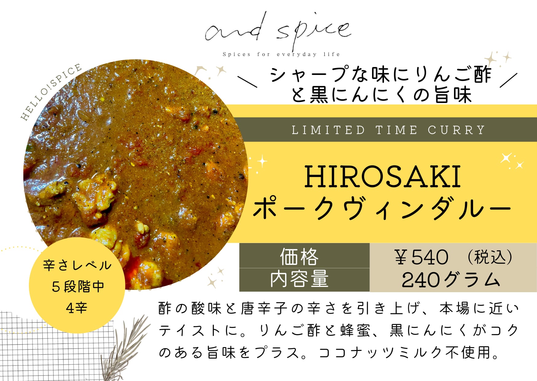 今回、辛さレベルは4にしました(定番のヴィンダルーは3に変更します!)。激辛では無いので激辛好きの方からはまだまだ!と思われるかもしれませんが、辛いものや酸っぱいものが好きな方、得意な方にはぜひぜひお試しいただきたいカレーです^^